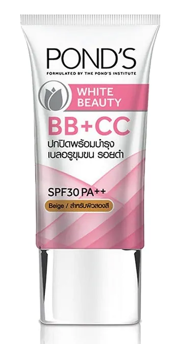 Covers and corrects for bright, even-toned skin, the Ponds White Beauty BB+CC cream mixes the benefits of skin care with color cosmetics. The White Beauty BB+CC Cream comes in two shades: light and beige.
