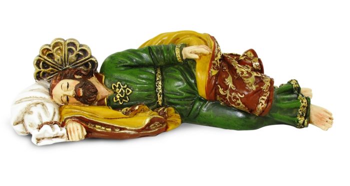 There is one story about the image of the "Sleeping St. Joseph" that involves Pope Francis, wo brought a statuette of this image from Argentina to keep near his room at St Marthas House. It depicts the Saint dressed in gold.trimmered dark green and red garments. Joseph is Lying down and asleep. This position is symbolic of the Gospel:it is always in his sleep that Jesuss adoptive father receives messages from heaven about Mary and wich name the Child should take and warnings about the danger Herod Represents, causing the flight into Egypt. Pope Francis writes prayer requests to the saint on a piece of paper and puts these underneath the statue. Made of resin.