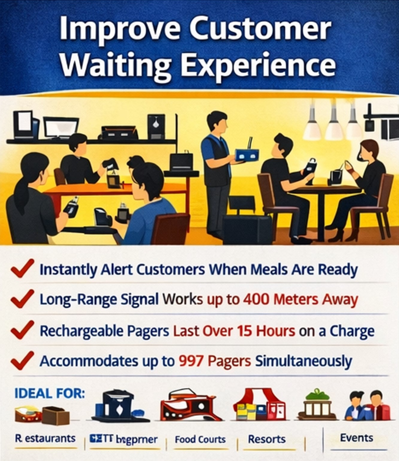 Each pager supports over 15 hours of standby time, perfect for all-day restaurant operations.